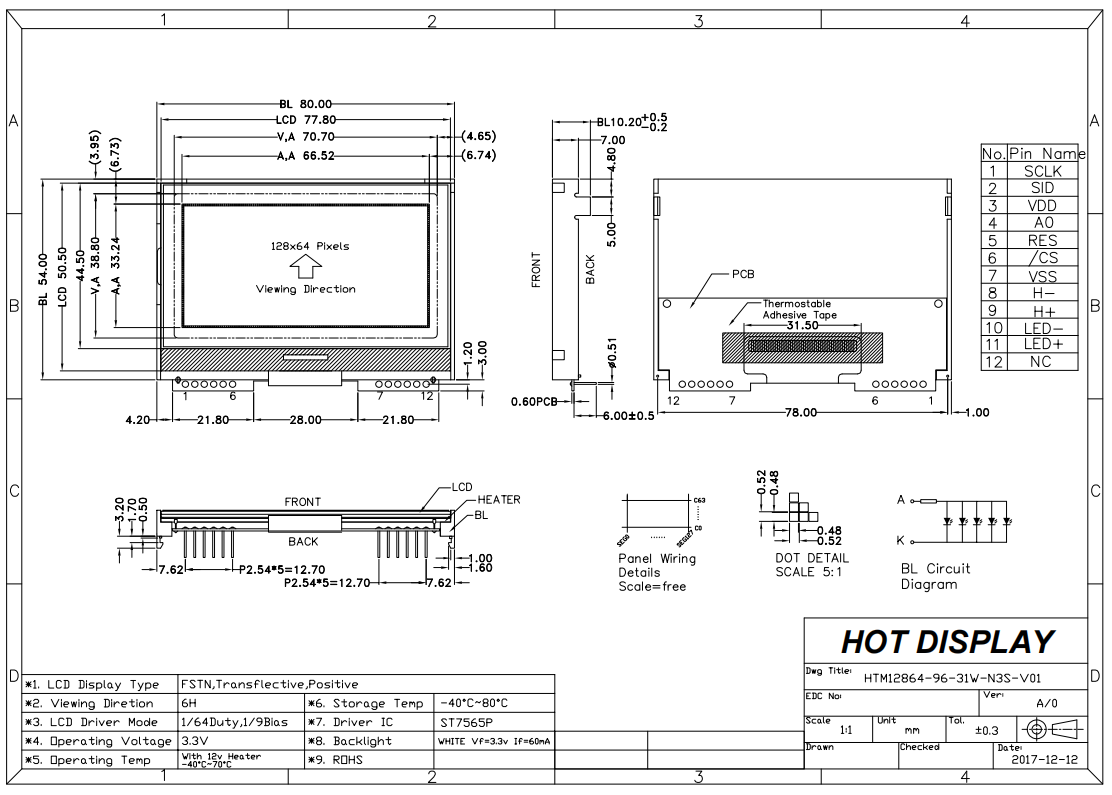 128x64 Graphic LCD Modules With Backlight HTM12864-96-31W-N3-V01 Graphic LCD Module 128x64 80x54 70.7x38.8 66.52x33.24 0.52x0.52 6H MCU Anti-static ESD 8KV -40~70℃ +3.3V ST7565P